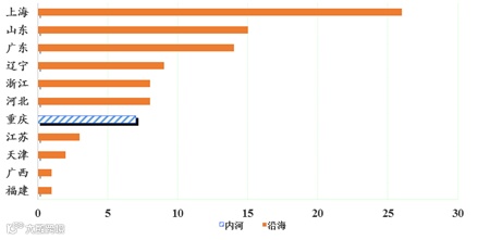从待完成任务的泊位数量来看,上海、山东任务仍最重,分别为26个和15个泊位,全部为沿海泊位,其次是广东、辽宁、浙江、河北和重庆。从泊位区域来看,待建任务以沿海泊位为主,待建的7个内河泊位均在重庆。具体如图2所示。
