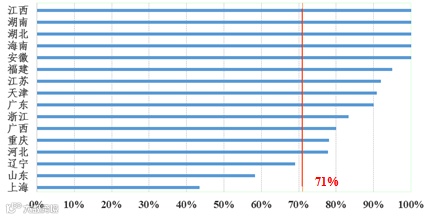 江西、湖南、湖北、海南、安徽已全面完成建设任务,上海、山东、辽宁等省份滞后于序时进度,其他省份基本满足进度要求,具体如图1所示。广东省2019年下半年内河港口岸电设施完成率显著提高。