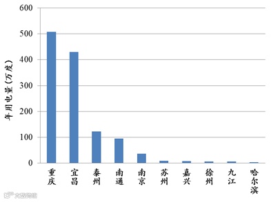 用电量最多的十个内河港口如图8所示,其中重庆港用电量最大,约为500万度,占内河港口总统计用电量的41%,其次为宜昌港和泰州港,年用电量约420万度和120万度。
