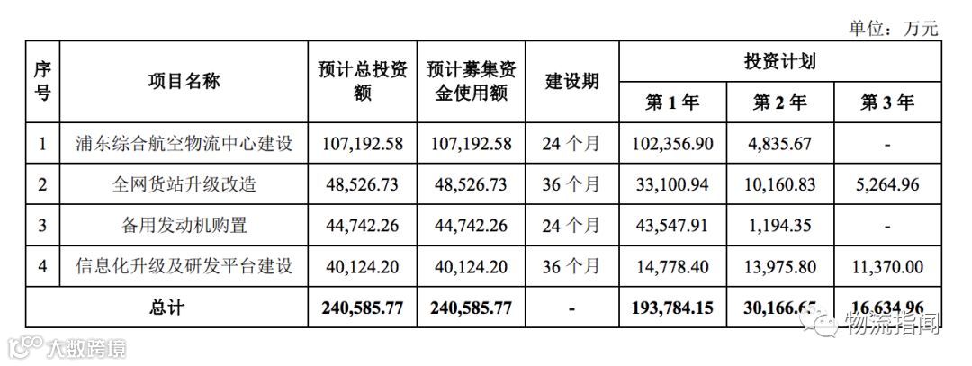 其此次IPO计划募资24亿元,其中10.72亿元用于浦东综合航空物流中心建设;4.85亿元用于全网货站升级改造;4.47亿元用于备用发动机购置、4亿元用于信息化升级及研发平台建设;投资项目均直接应用于主营业务发展。
