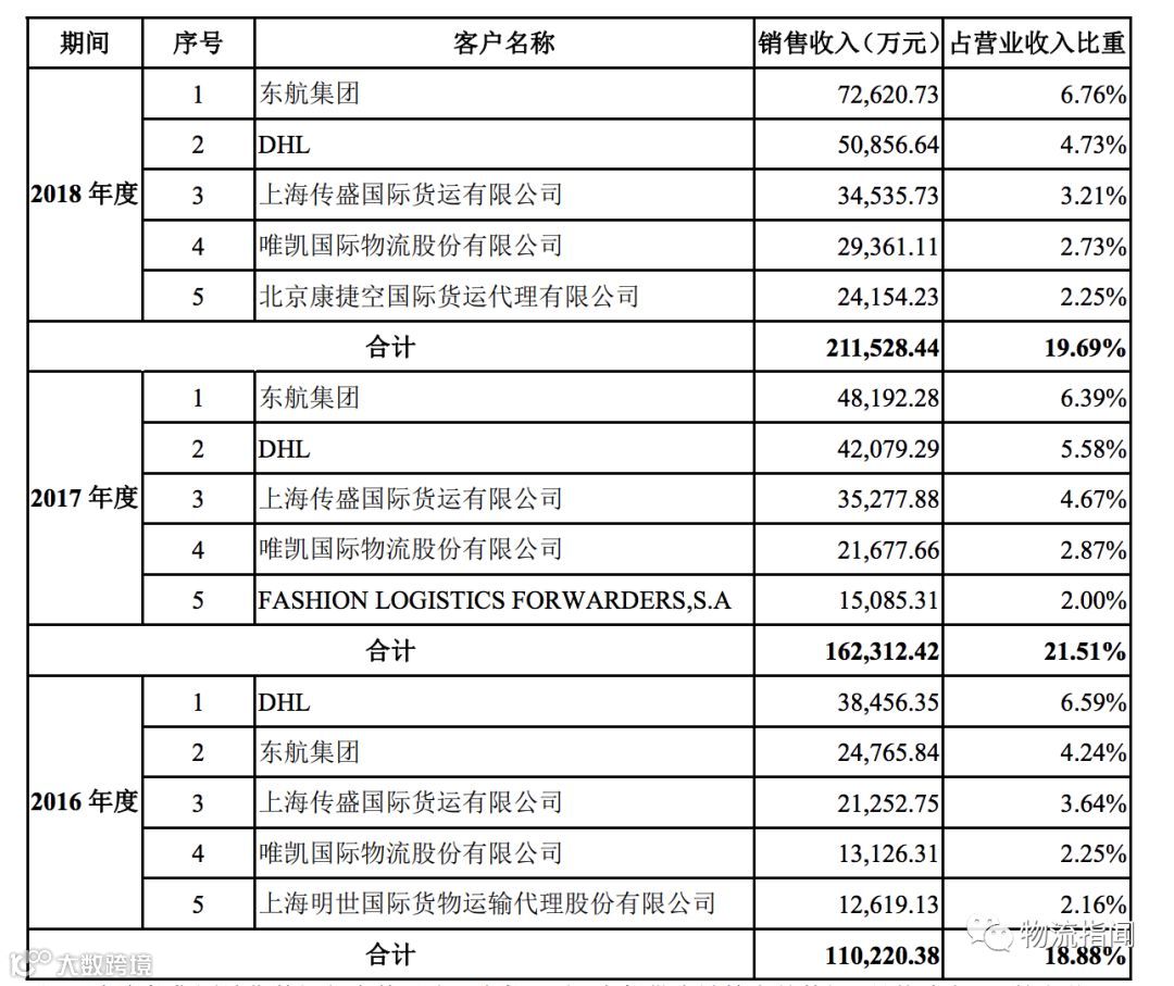 报告期内,其前四大客户集中于东航集团、DHL、上海传盛国际货运有限公司、唯凯国际物流股份有限公司。
