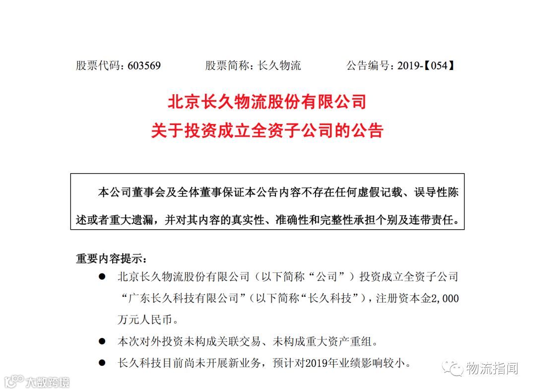 6月11日,长久物流发布公告称,根据公司业务发展需要,促进公司信息化发展战略升级,提升企业核心竞争力,公司投资成立全资子公司“广东长久科技有限公司”(“长久科技”),注册资本金2000万元人民币。