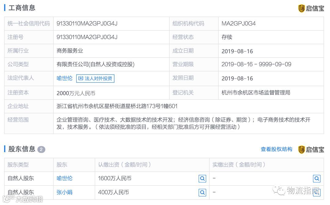 资料显示,浙江坤昱企业管理有限公司注册资本2000万元人民币,成立于2019年8月,注册地浙江省杭州市余杭区,法定代表人喻世伦,公司经营范围为企业管理咨询、医疗技术、大数据技术的技术开发;经济信息咨询(除证券、期货);电子商务技术的技术开发,技术服务。