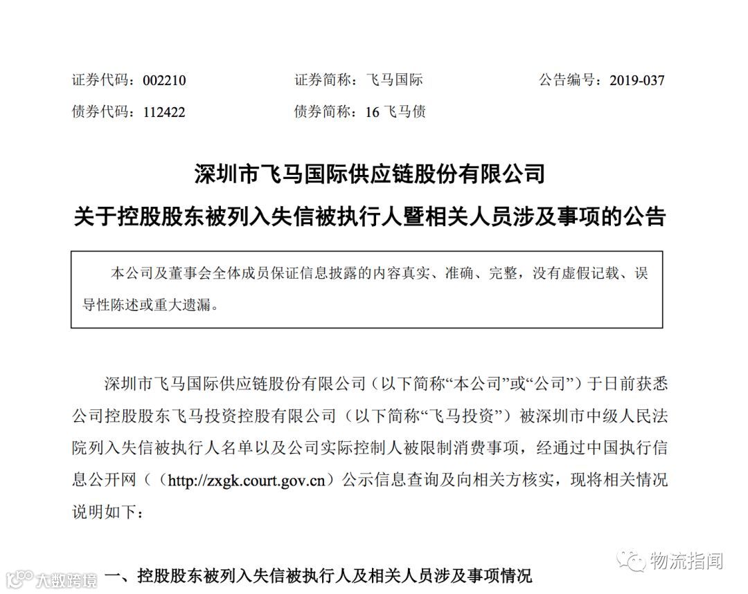近日获悉,深圳市飞马国际供应链股份有限公司被立案调查,列入失信黑名单且资产被冻结。