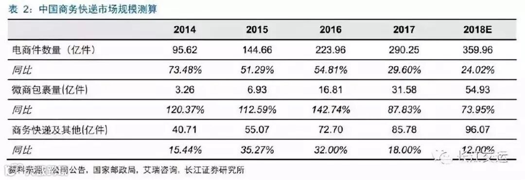 考虑到商务件市场与宏观经济息息相关,行业成长性低于电商件市场,整体增速表现稳健。根据我们的测算,2017年国内商务件市场大约86亿件,同比增速大约18%。
