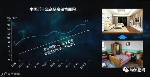 据统计:2008年中国商品房销售面积6.6亿平方米,2017年达到16.4亿平方米,十年间大约翻了1.5倍,累计销售面积118亿平方米,年复合增长率10.6%。