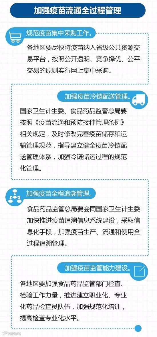 (三)加强疫苗全程追溯管理。食品药品监管总局要会同国家卫生计生委加快推进疫苗追溯信息系统建设,采取信息化手段,加强疫苗生产、流通和使用全过程追溯管理。国家卫生计生委要依托全民健康保障信息化工程,加快推进全国预防接种信息管理系统建设,逐步实现不同地区预防接种信息的交换与共享。