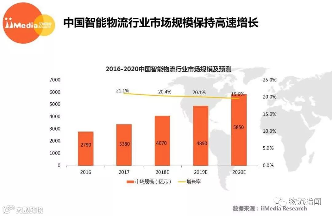 iiMedia Research(艾媒咨询)数据显示,2017年中国智能物流行业市场规模达3380亿,较2016年增长21.1%。未来预计中国智能物流行业市场规模保持持续高速增长,2020年中国智能物流行业市场规模将达5850亿。在“工业4.0“和大数据的背景下,需求被不断激发,中国智能物流行业未来有望迎万亿级大市场。