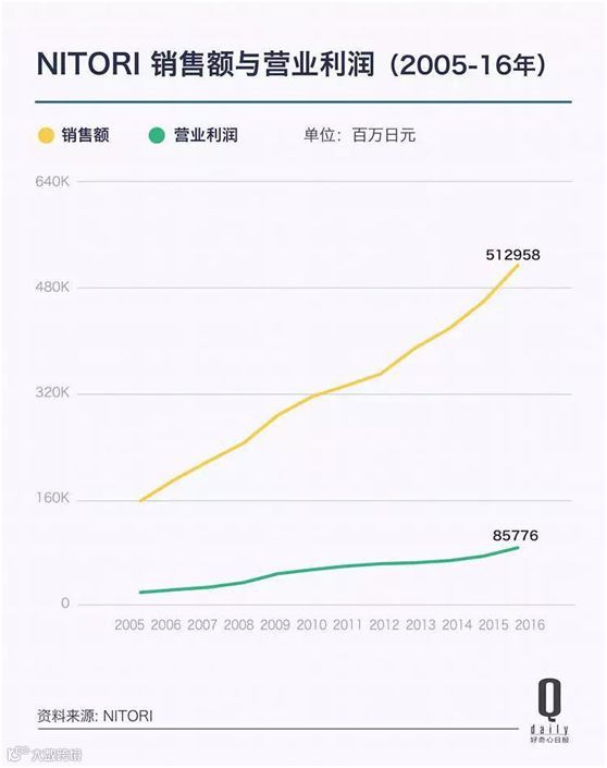 这种从商品、生产制造、物流到零售都整合起来的SPA模式使得NITORI的利润率可以达到16%,远高于日本家具行业平均5%的利润率。