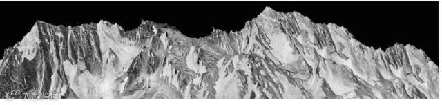 通过光线逆转手法,使图像里的山峦显得更加高耸,冰川的细节使得整个画面看起来像是浮现在银河系当中,将观者的视觉引至一种幻象的地步。让人不禁感慨,斗转星移之间,时光已超越人类的能力范畴,主动完成了自然的鸿篇巨制。