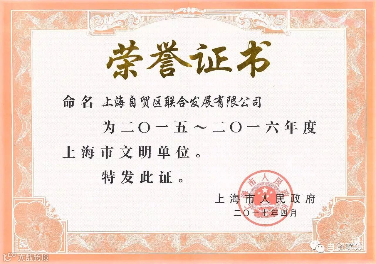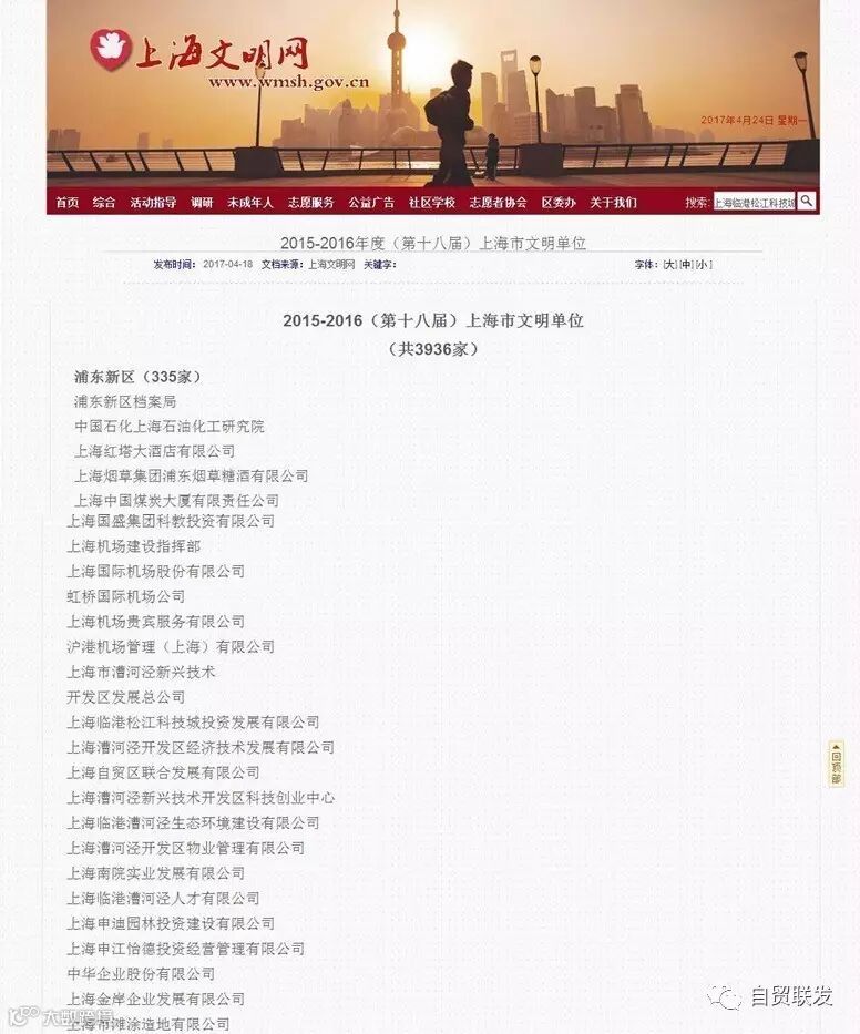 4月18日,2017年上海市精神文明建设工作会议在市委党校召开,上海自贸区联合发展有限公司荣获2015-2016年度(第十八届)“上海市文明单位”称号。
