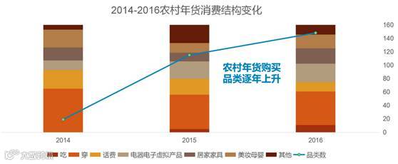 更值得一提的是,农村用户网购消费结构也变得吃穿住用更为均衡。购买服装的年货比重逐渐下降,电器、家居、美妆母婴类消费持续上升,平均订单额已经超过250多元,给予农村电商巨大的想象空间。商务部发布的数据也显示,2015年农村网购市场规模达3530亿元,同比增长96%,2016年预估可达4675亿元。随着2017年货节的全面打响,农村电商将再次迎来加速成长的机会。