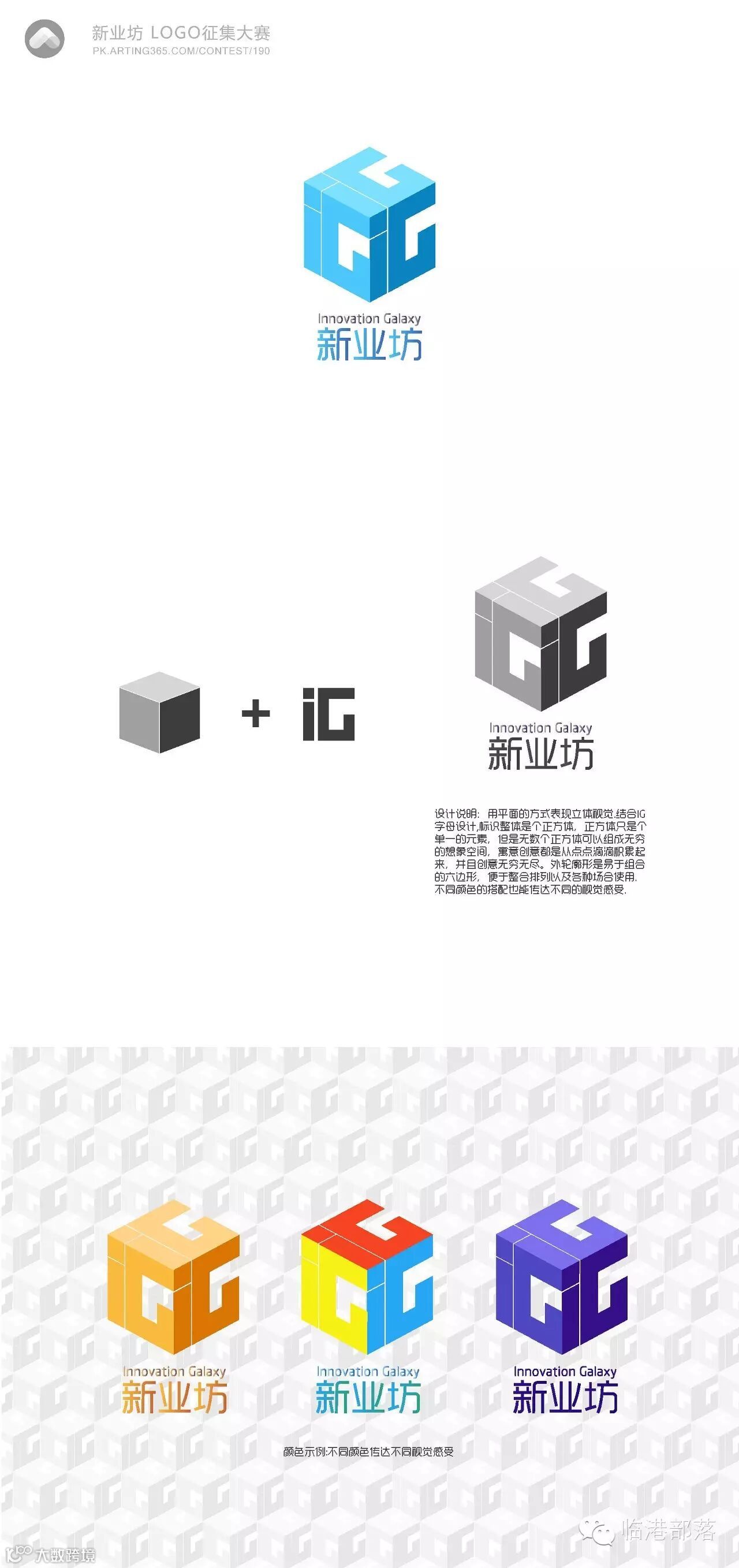 设计说明:用平面的方式表现立体视觉,结合IG字母标识,标识整体是个正方体,正方体是个单一的元素,但是无数个正方体可以组成无穷的想象空间,寓意创意都是从点点滴滴积累起来,并且创意无穷无尽.外轮廓是易于组合的六边形,便于整合排列以及各种场合使用,不同颜色的搭配也能传达不同的视觉感受。