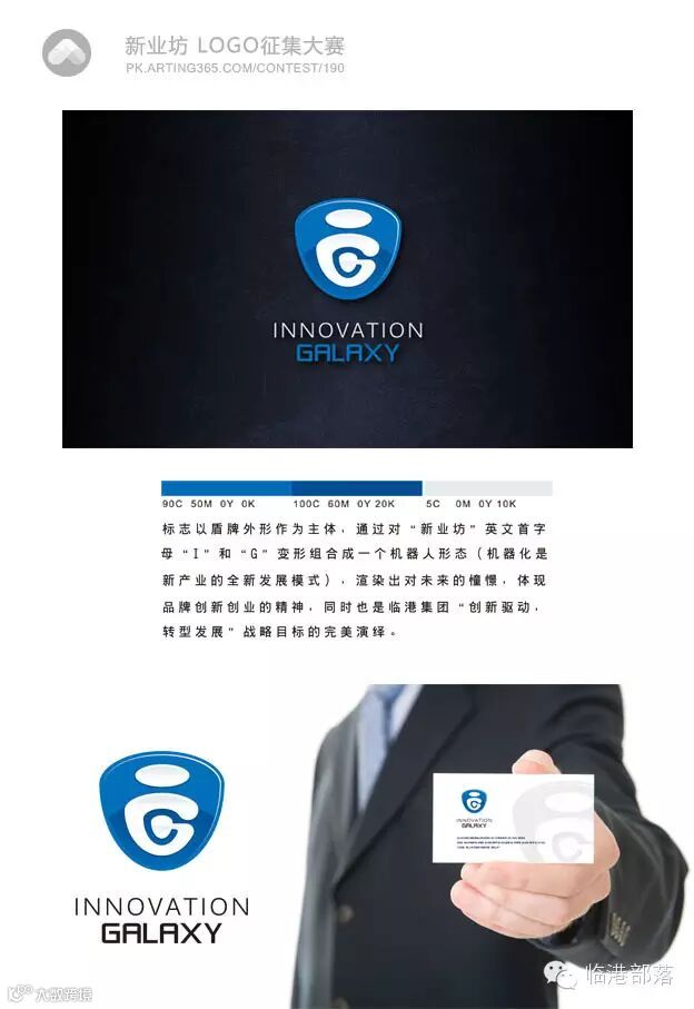设计说明:标志以盾牌外形作为主体,通过对”新业坊“英文首字母“I”;和“G”;变形组合成一个机器人形态(机器化是新产业的全新发展模式),渲染出对未来的憧憬,体现品牌创新创业的精神,同时也是临港集团”创新驱动,转型发展“战略目标的完美演绎。