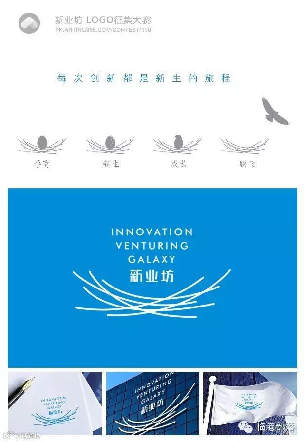 设计说明:创新、创业就是不断挑战和颠覆,好比一场求知的旅程,充满了无限可能。新业坊像是孕育与呵护新生的“巢”,为创新产业搭建了舒适的“家”,产业在“巢”里出生、成长、腾飞,走向更为宽广的未来。新业坊为产业发展创造了成长环境、孕育着梦想和希望。