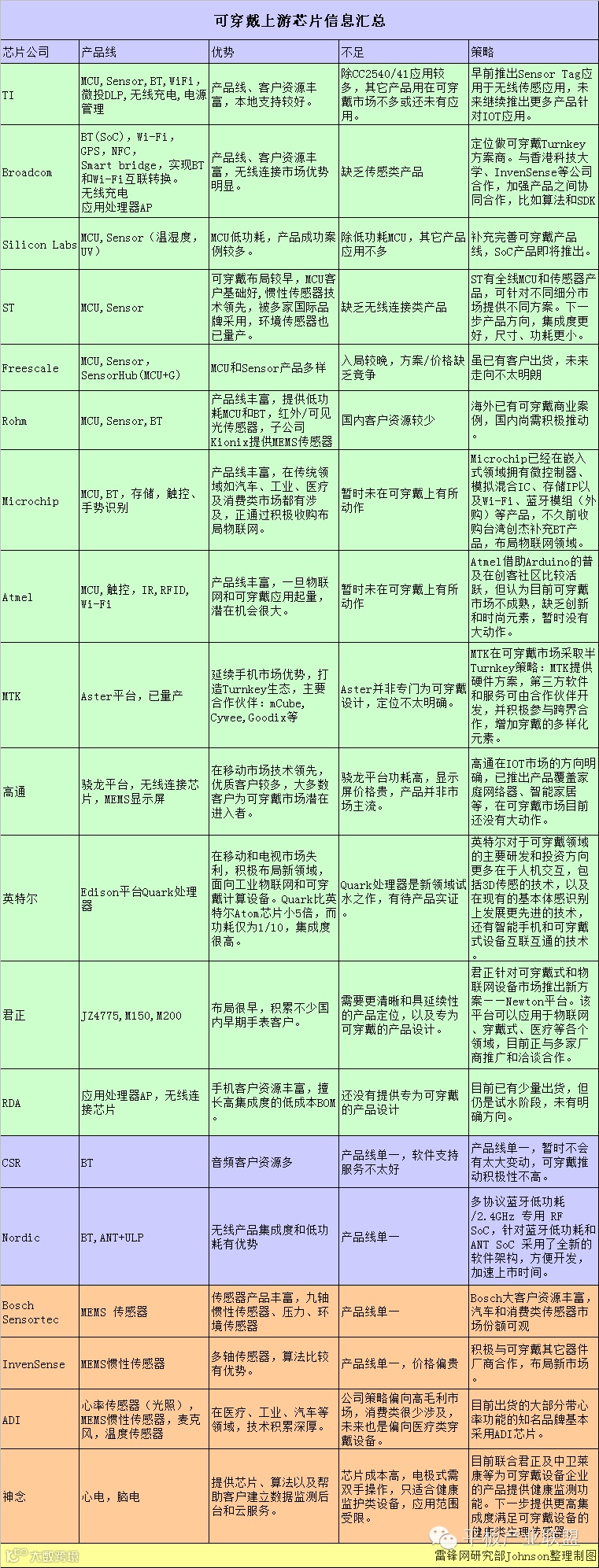 无线连接芯片的供应商也较多,仅用在可穿戴设备上的蓝牙单芯片,Nordic和TI用量较大,而集成BT,Wi-Fi,GPS等的组合芯片,博通、高通、MTK都有方案,博通是该领域龙头。手环类产品,蓝牙单芯片应用较多,对于复杂应用,组合芯片较有优势,这取决于应用场景和功耗考量。