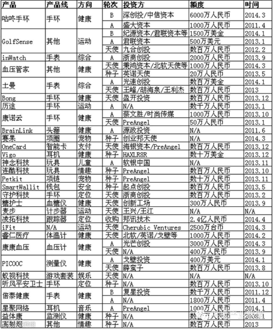 回到国内可穿戴设备一级市场,按照公开数据显示,在下游领域投资总共发生超过30起,轮次从种子到B轮都有,产品主要集中在手表、手环,应用领域集中在运动、健康、医疗,跟踪定位、宠物。综合来看,A轮的投资额度多超过千万,投资时间多发生在2013年,多数投资为天使/种子投资,最活跃的机构当属PreAngel,其次有深创投、英诺天使等,看样子是有意在布局。