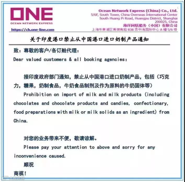 有出口奶制品到印度的外贸企业注意了!近日,印度外贸总局发布通知,禁止从中国出口奶类及奶类制品至印度港口(包括巧克力及奶制食品及糖果及甜点及牛奶食品制剂及作为原料的牛奶固品)。已有船公司发布相关通知,有涉及这类货物出口至印度的货代货主们,具体情况请向相关船公司咨询。