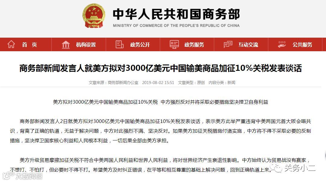商务部新闻发言人8月2日就美方拟对3000亿美元中国输美商品加征10%关税发表谈话,表示美方此举严重违背中美两国元首大阪会晤共识,背离了正确的轨道,无益于解决问题,中方对此强烈不满、坚决反对。如果美方加征关税措施付诸实施,中方将不得不采取必要的反制措施,坚决捍卫国家核心利益和人民根本利益,一切后果全部由美方承担。