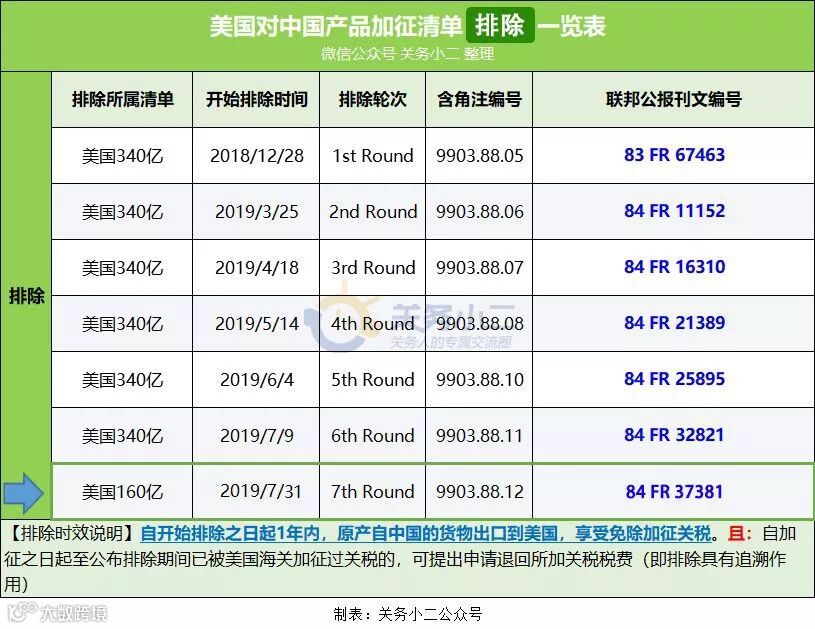 顺便更新下,之前推送的美国对中国160亿美元加征清单部分排除产品,美国联邦公报已经在2019年7月31日正式公布,意味着自2019.7.31日期1年内,上述排除清单内的产品免加征关税,且2018.8.23日至2019.7.31日期间出口美国被加征的关税可以向美国海关申请退回。