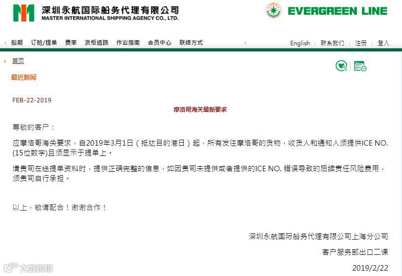 自 2019 年 3 月 1 日(抵达目的港日)起,所有发往摩洛哥的货物,收货人和通知人须提供 ICE NO.(15 位数字)且须显示于提单上。请在送提单资料时,提供正确完整的信息,如因贵司未提供或者提供的 ICE NO. 错误导致的后续责任风险费用,须贵司自行承担。