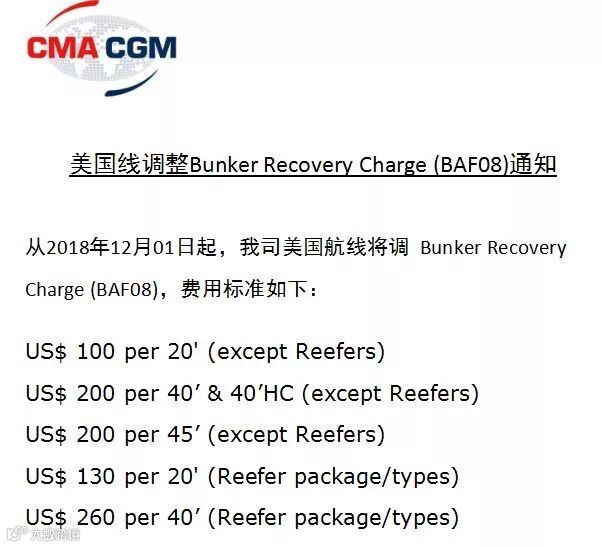 从2018年12月01日起,美国航线将调Bunker Recovery Charge (BAF08)。