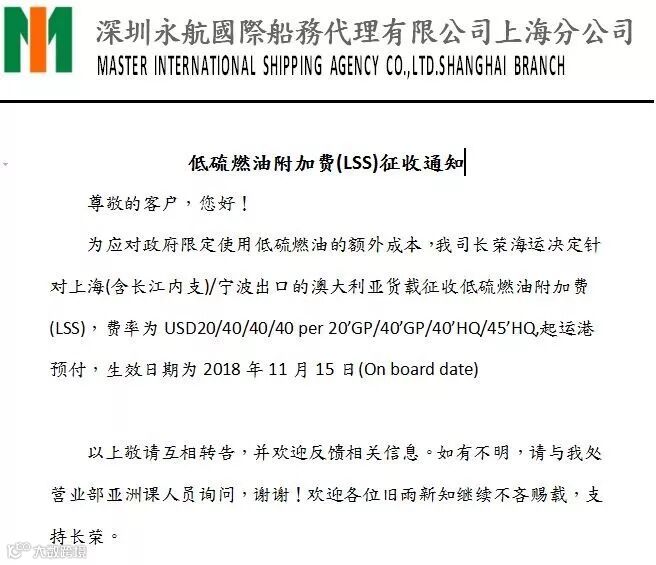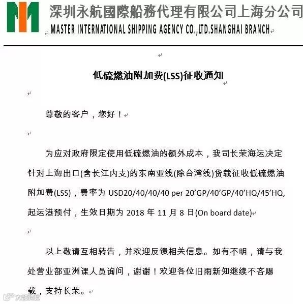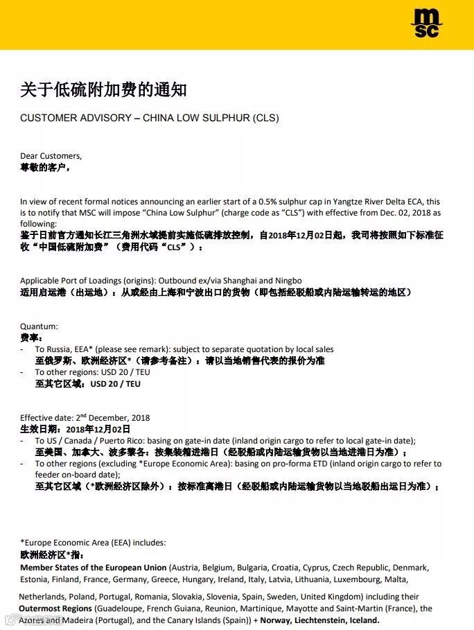 尊敬的客户,鉴于日前官方通知长江三角洲水域提前实施低硫排放控制,自2018年12月02日起,我司将按照如下标准征收“中国低硫附加费”(费用代码“CLS”)。