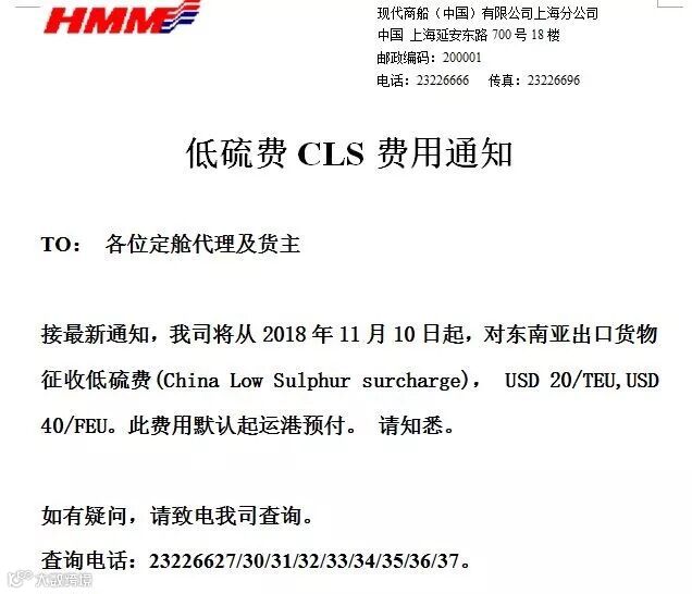 HMM出口东南亚、中东印巴征收低硫费通知