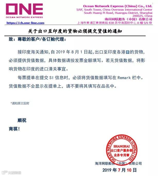 自2019年8月1日起,出口至印度各港口的货物,必须提供货值数据,具体数据按发票金额填写。若无货值数据,将影响货物在印度的进口清关事宜。