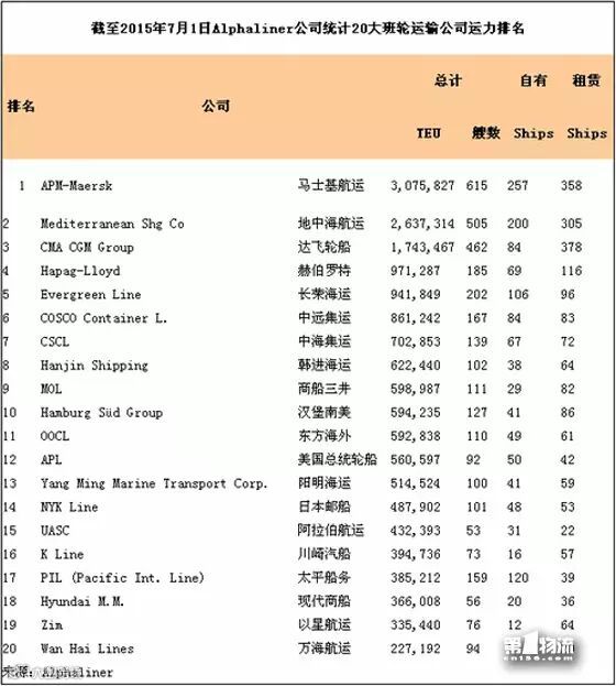 Alphaliner最新运力数据显示,截止2015年7月6日,全球班轮公司运力100强中排名前三的分别是马士基航运、地中海航运和达飞轮船。第四名到第十名依次为:赫伯罗特、长荣海运、中远集运、中海集运、韩进海运、商船三井、汉堡南美船务集团。