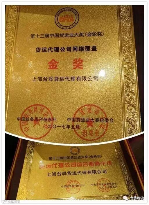 5月18日,第十三届中国货运业大奖(金轮奖)评选活动隆重开幕,我司在会上荣获“货运代理公司综合服务十佳”和“货运代理公司网络覆盖三甲”两大奖项。