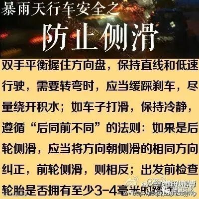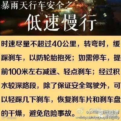 【暴雨天行车安全八提示】眼下全国多数地方相继进入汛期,连绵的雨天让人在备感凉爽的同时,也让许多车主感受到了暴雨的无情。暴雨天交通事故频发,如何才能在暴雨天保证行车安全呢?快点戳图↓↓了解暴雨天行车安全知识,为平安一夏转发!