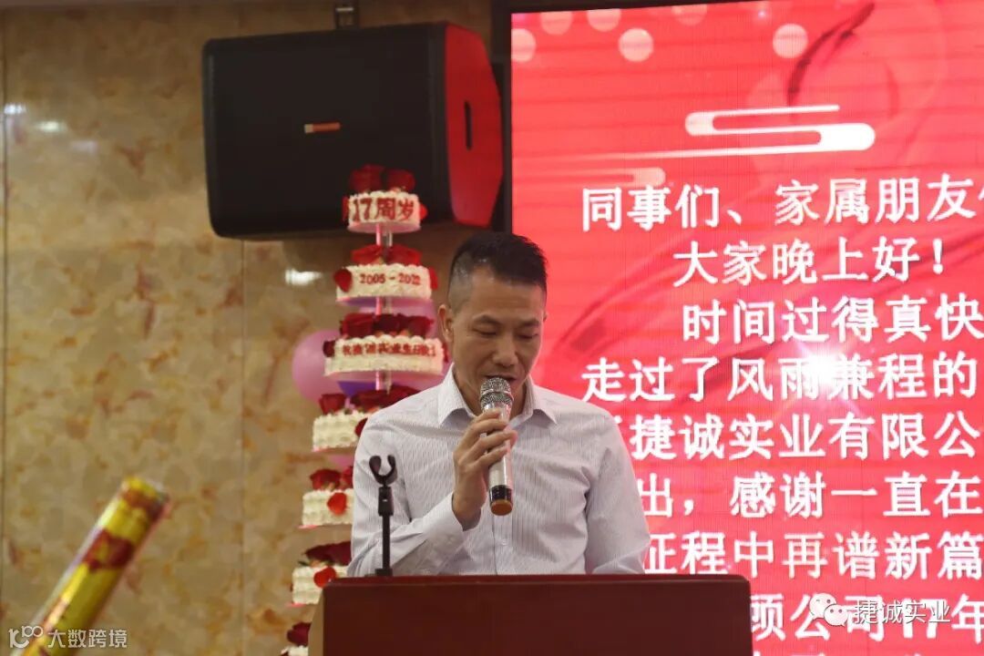 晚宴开始,捷诚实业董事长林锋在17周年庆中致辞。