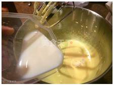 打到松软,蓬松,淡黄色后,加入油和牛奶