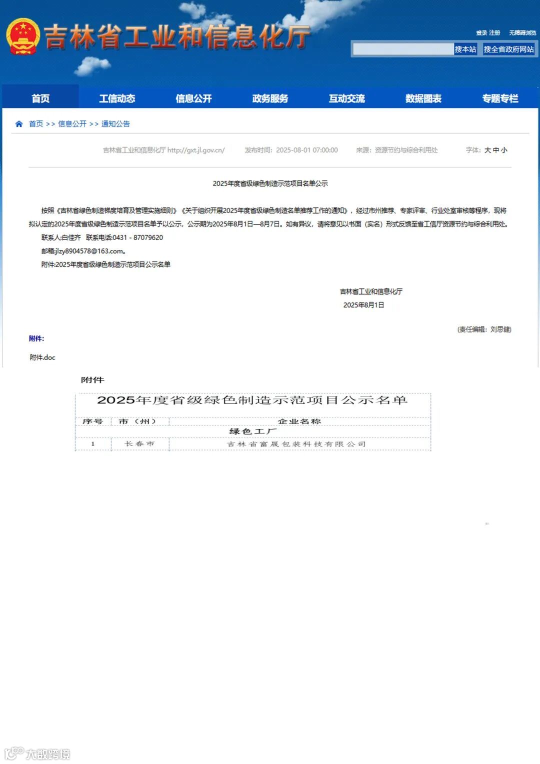 本网讯(记者 梁国辉/文 供图)8月1日,吉林省工业和信息化厅正式公布2025年度省级绿色制造示范项目名单,物流与后市场事业部下属吉林省富晟包装科技有限公司(以下简称“富晟包装公司”)凭借在绿色生产体系构建与节能减排领域的突出成效,成功斩获“省级绿色工厂”荣誉称号。