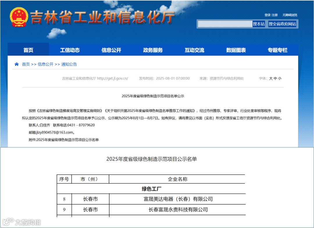 本网讯 (记者 杨明月/文 供图)8月1日,吉林省工业和信息化厅公布的“2025年度省级绿色制造示范项目名单公示”中,新能源事业部富晟永贵、富晟美达公司凭借在绿色生产、节能减排方面的卓越表现,获得“省级绿色工厂”荣誉称号。
