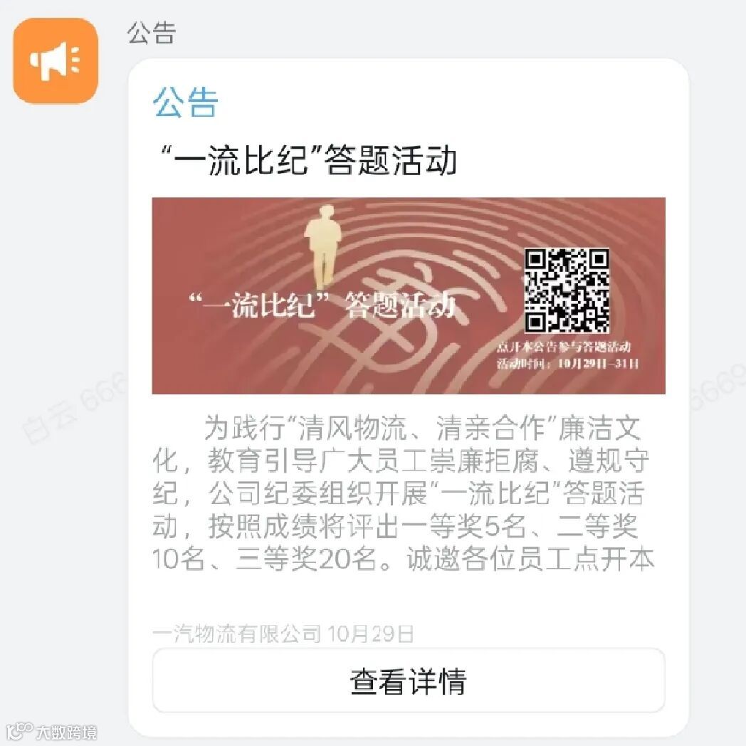 让教育接地气、触人心,是一汽物流本次活动的核心。各公司“纪律小教员”聚焦有管理权限的操作岗员工,开展“定制化”廉洁从业教育,通过讲身边人、说身边事,引导员工深刻认识“微腐败”的危害,不断树牢纪律意识与规矩意识,逐步养成在监督约束下工作生活的习惯。