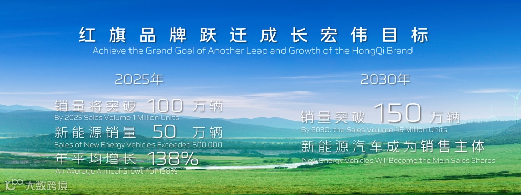 到2025年,红旗品牌总销量将达到100万台级,其中新能源汽车销量超过50万辆,同比2022年增长12.5倍,年均增长138%;到2030年,红旗品牌销量突破150万辆,其中新能源汽车成为销售主体。同时品牌影响力、创新能力和整体实力等,也将和销量指标一起,进入世界高端品牌的第一阵营,真正达成“中国第一、世界著名”,真正实现新红旗新能源强势崛起。