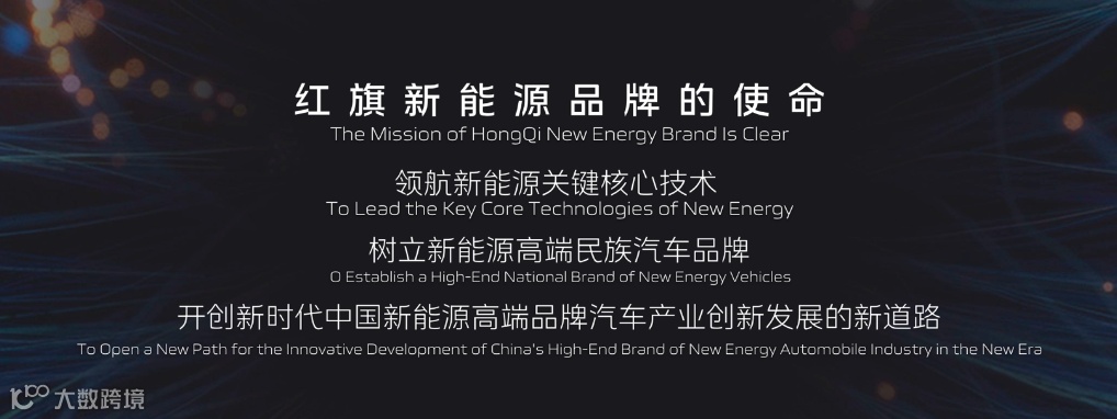 红旗新能源品牌的使命是:领航新能源关键核心技术,树立新能源高端民族汽车品牌,开创新时代中国新能源高端品牌汽车产业创新发展的新道路。