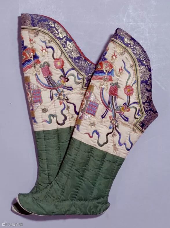 红色纳纱彩绣龙凤辑米珠高靿绵袜、浅杏黄缎绣五谷丰登绵袜