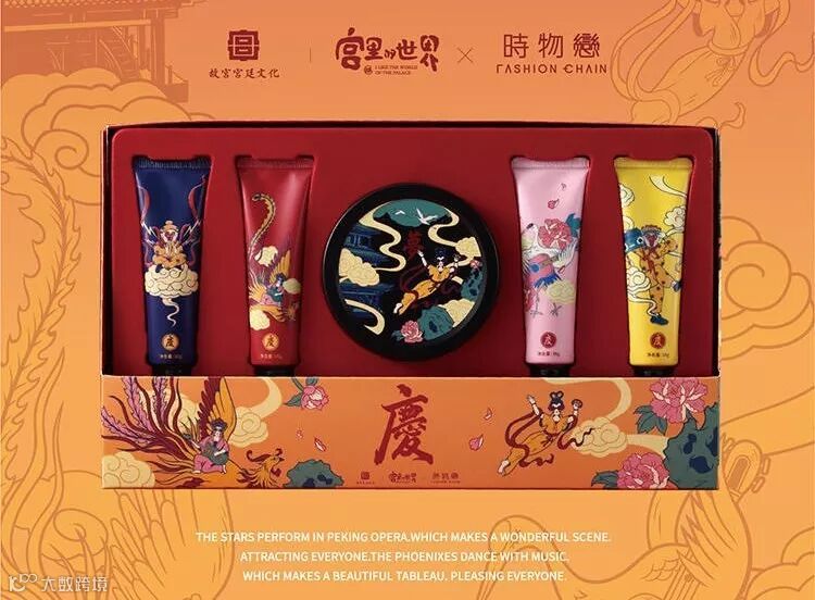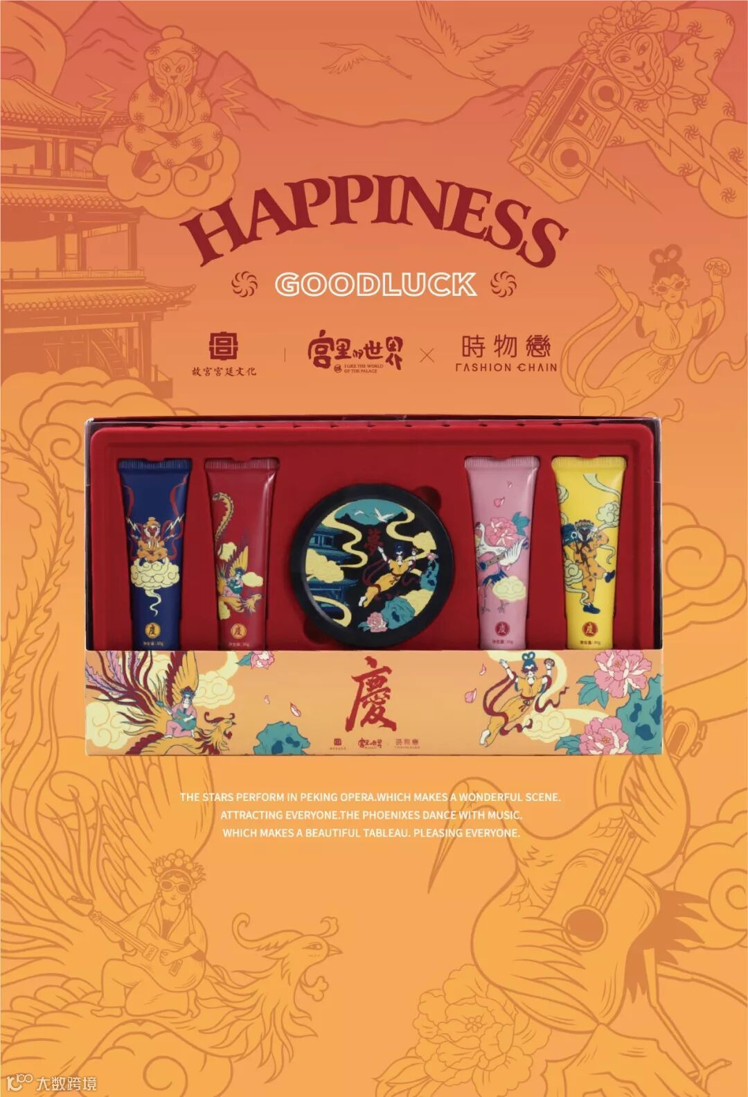 深谙东方生活美学的北京故宫宫廷文化,联手引领国风时尚潮流的时物恋,在年关将近处处喜气祥和的气氛中,提取故宫元素,以现代年轻人喜爱的手绘形式重新演绎,成就“庆”主题滋润套装——5个护手霜+1个护足霜。