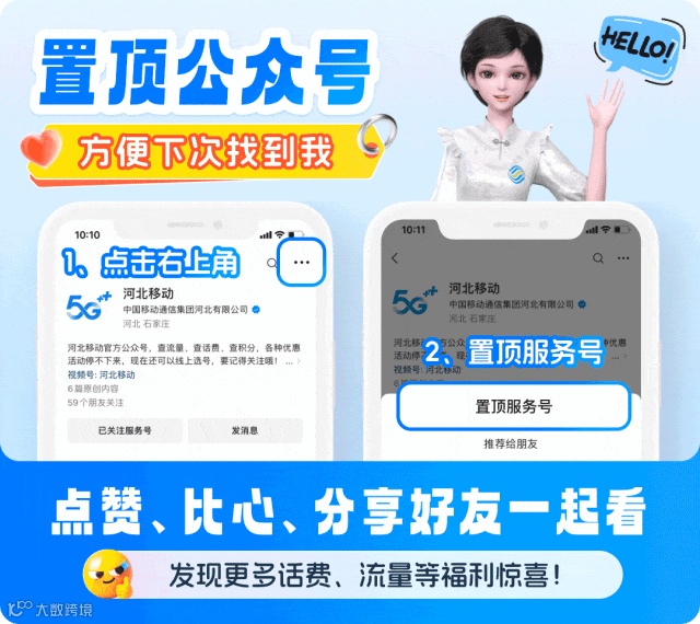 河北移动官方公众号,查流量、查话费、查积分,各种优惠活动停不下来,现在还可以线上选号,要记得关注哦! 经营许可证编号:A1.A2-20090001、A2.B1.B2-20100001