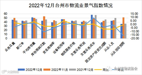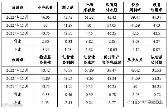 业务总量指数同比有所上升,环比有所下降;新订单指数同比有所下降,环比有所上升。业务总量指数为46.05%,同比上升2.3个百分点,环比下降3.95个百分点,处于荣枯线以下收缩区间运行;新订单指数为43.42%,同比下降0.33个百分点,环比上升1.53个百分点,处于荣枯线以下收缩区间运行,受疫情放开影响,总体物流需求短期内缩减,临近春节,企业年前备货,新订单量有所回升。