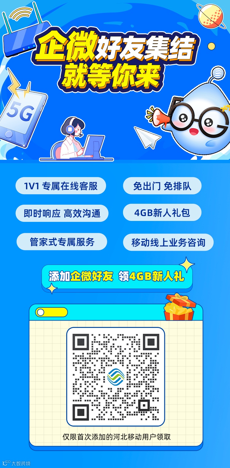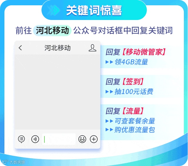 河北移动官方公众号,查流量、查话费、查积分,各种优惠活动停不下来,现在还可以线上选号,要记得关注哦! 经营许可证编号:A1.A2-20090001、A2.B1.B2-20100001