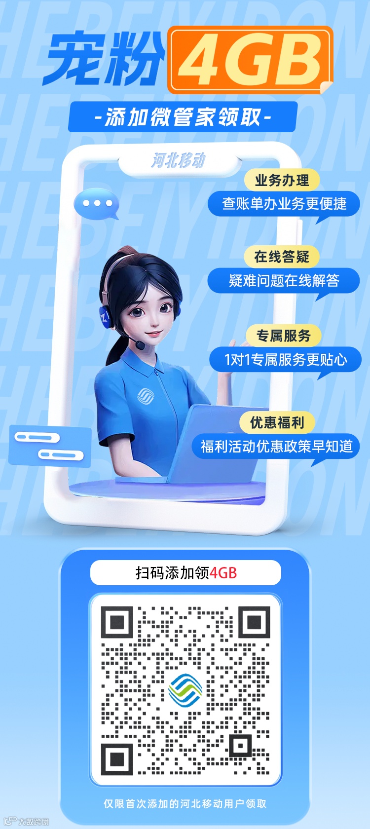 河北移动官方公众号,查流量、查话费、查积分,各种优惠活动停不下来,现在还可以线上选号,要记得关注哦! 经营许可证编号:A1.A2-20090001、A2.B1.B2-20100001