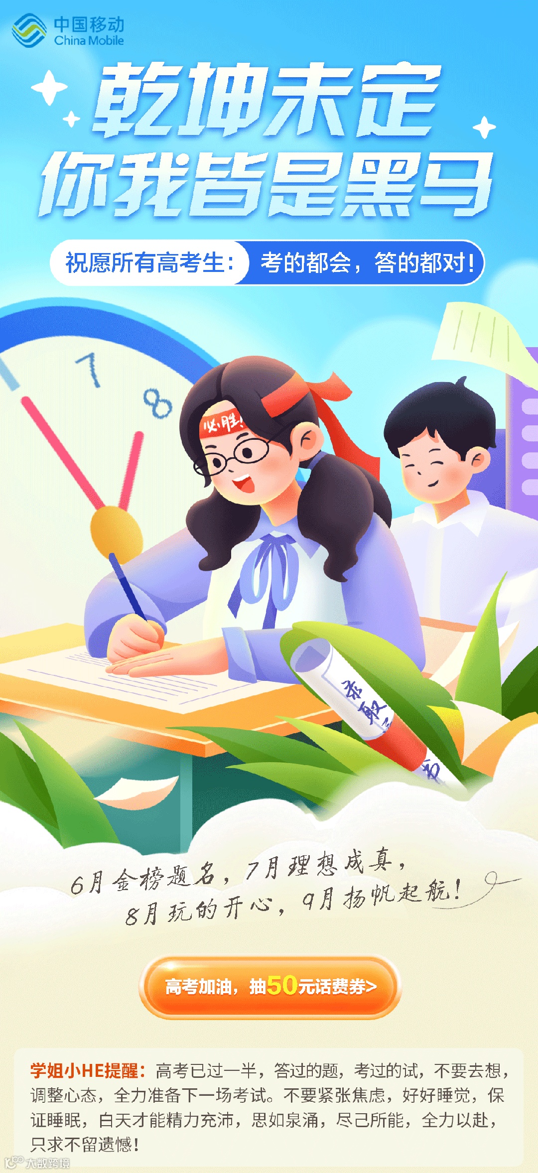 如今乾坤未定,你我皆是黑马,祝愿各位学子乘风破浪,披荆斩棘,我们高处相见!