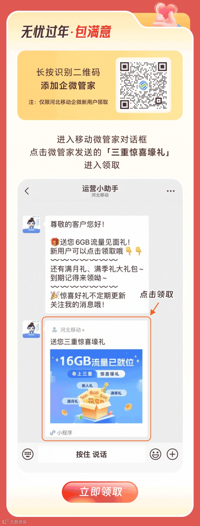 河北移动官方公众号,查流量、查话费、查积分,各种优惠活动停不下来,现在还可以线上选号,要记得关注哦! 经营许可证编号:A1.A2-20090001、A2.B1.B2-20100001