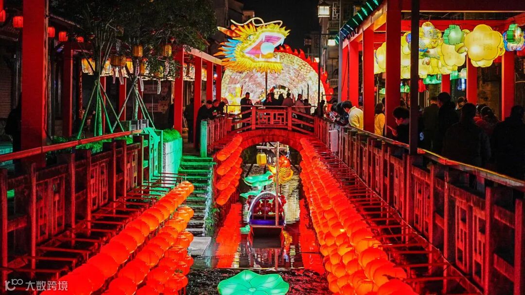 祥龙华夏,以“二月二 龙抬头”风俗基调为宋渠直街定制的巨型龙灯盘踞河道,一派繁荣吉祥。正逢甲辰龙年,春龙抬首,鸿运当头。再现泱泱华夏千年风采,风调雨顺的祈请更是国泰民安的心之所向。
