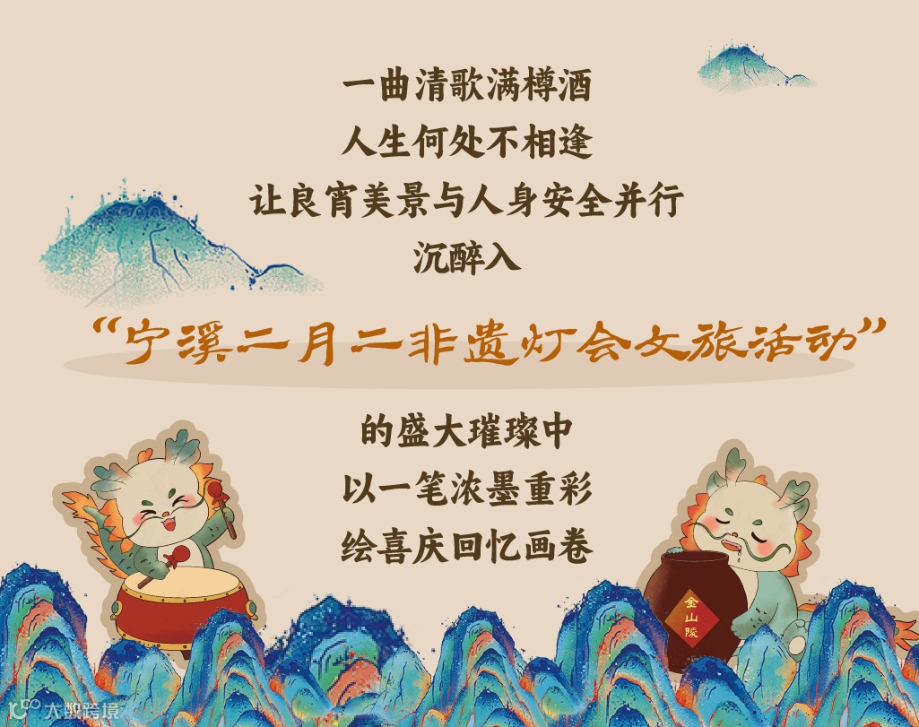 盛世灯明,直街连排花灯。“龙饮微醺”、“芳华微醺”、“非遗微醺”、“盛景微醺”、“锦绣微醺”等十余段主题灯景、近千种灯型耀映宁溪,点亮千年宋韵的辉煌灯火。花满市,月侵衣,灯海斑斓宛若星河,龙吟夜,醉当时。以绚烂的灯景为背景,定格璀璨与美好,与斑斓间,凝驻瞬间。