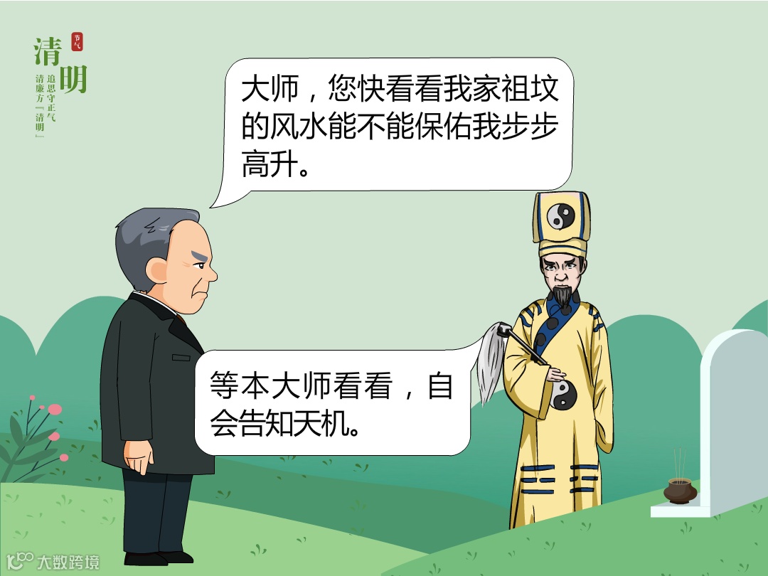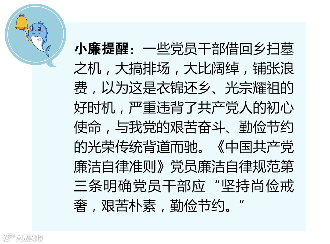 清明节是缅怀亲人,寄托哀思的重要传统节日。党员干部应以身作则,率先垂范,自觉抵制祭祀中封建迷信行为,严格落实中央八项规定精神,革除旧俗,文明祭扫。让我们积极行动起来,从自己做起,从家庭做起,从现在做起,争做传统文化的传承者、中华美德的践行者、文明祭扫的带头人、廉洁自律的模范生,共度一个平安文明、绿色节俭、安全和谐的清明节。